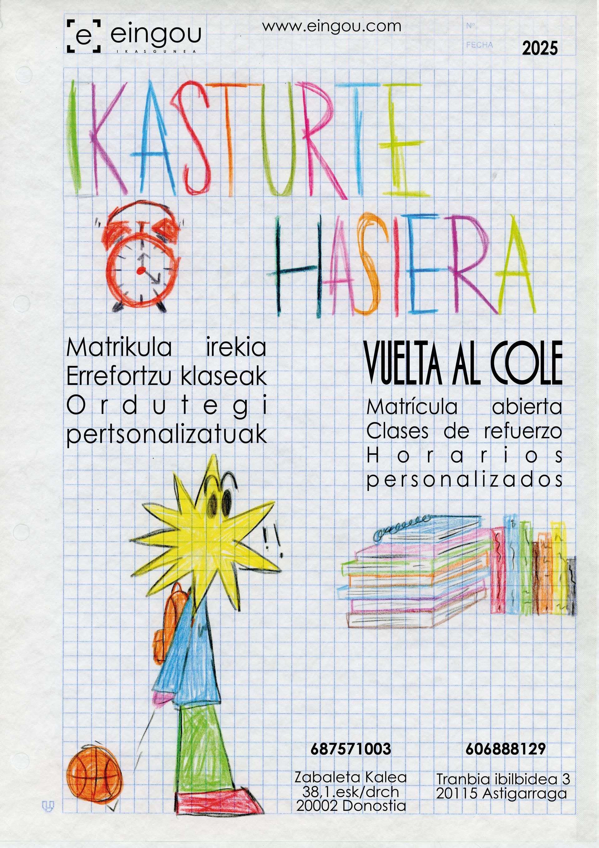En el proceso de aprendizaje, es muy recomendable utilizar algunas técnicas, por lo que antes de empezar en la ikastola es imprescindible que todo se organice, cómo y cuándo se va ha realizar el trabajo. Por ello, las clases comenzarán el mismo 1 de SEPTIEMBRE en EINGOU.